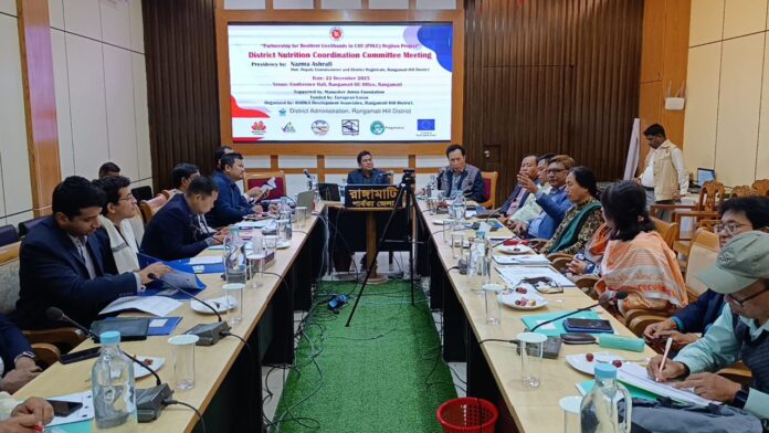 রাঙামাটিতে জেলা পুষ্টি সমন্বয় কমিটির (ডিএনসিসি)’র সমন্বয় সভা অনুষ্ঠিত হয়েছে। পার্বত্য চট্টগ্রামের পিছিয়ে পড়া গ্রামীন মানুষের ফলিত পুষ্টি নিশ্চিত করতে ‘অংশিদারিত্বের ভিত্তিতে পার্বত্য চট্টগ্রামে সহনশীল জীবিকার জন্য সহায়তা’ (পিআরএলসি) শীর্ষক প্রকল্প পরিচালিত হচ্ছে। প্রকল্পের কার্যক্রম এগিয়ে নেওয়ার জন্য সভায় ডিনএনসিসির সহযোগীতা বৃদ্ধি করা এবং পুষ্টির ক্ষেত্রে সমস্যায় থাকা পার্বত্য তিন জেলায় সাধারণ মানুষের মাঝে পুষ্টি সচেতনতা, প্রয়োজনীয় পুষ্টি গ্রহণ এবং পুষ্টির সরবরাহ নিশ্চিত করতে করনীয় সম্পর্কে আলোচনা করা হয়।